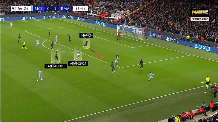 Тут пример хорошей передачи. Винисиус указывает на очередное открывание Аканджи. К швейцарцу вылетает Начо: