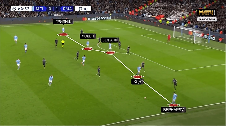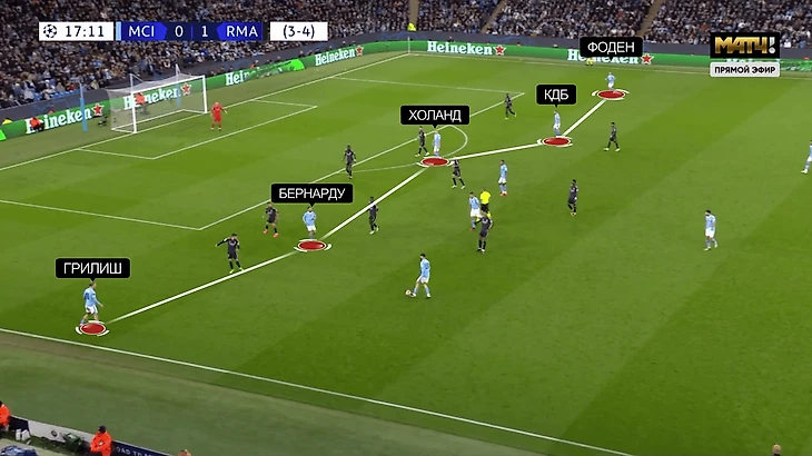 В позиционной структуре тоже произошли важные изменения. До перерыва «Сити» использовал вариант, при котором левее располагаются Грилиш и Бернарду, правее – Фоден и КДБ.