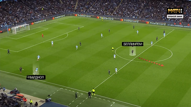В эпизоде с голом Джуд сыграл в иной манере. «Мадрид» снова вытянул одного из защитников «Сити» – в этот раз Гвардиола. Партнерам пришлось смещаться, из-за чего образовалась дыра – туда и проник Беллингем. Родри нагнал, но Джуд развил атаку на технике: