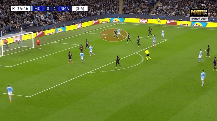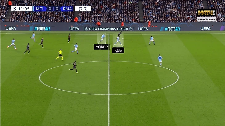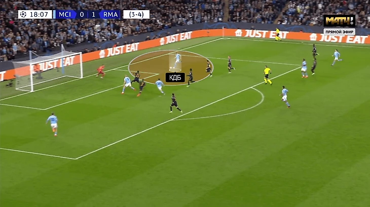 Бонусный инструмент – реакция игроков «Сити» на потери. В первом матче запаздывала и давала «Мадриду» шанс разбежаться. Во втором был не только Уокер, но и партнеры, которые сразу шли в отбор. Например, здесь Кайл патрулирует зону, но еще ему помогает КДБ: