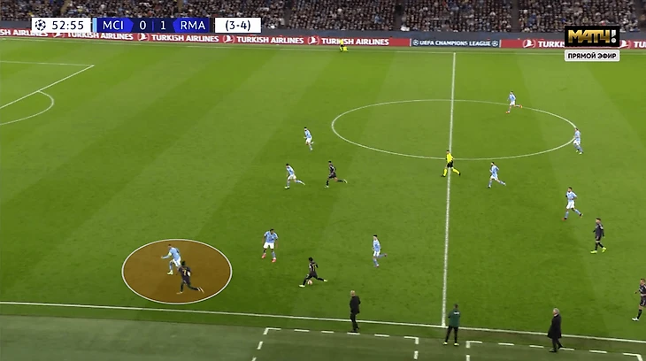 В этот раз «Реал» тоже пытался прессинговать, но в усеченном формате. Выдвигались группой из пяти-шести человек, но оставляли «Сити» минимум один вариант на чужой половине. Сзади сохраняли численный перевес против Холанда: