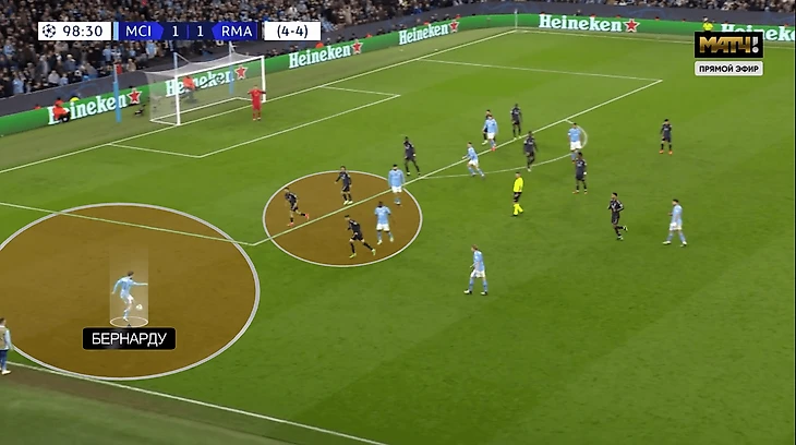 Другой по типологии момент из дополнительного времени. В этот раз Доку стянул игроков «Реала» в середину. Кучу пространства на фланге получил Бернарду: