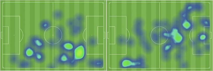 Пожалуй, самым интересным изменением стало появление Аканджи в левом полуфланге. Вот характерный контраст в тепловой карте. До перерыва швейцарец предпочитал правую зону, после – левую: