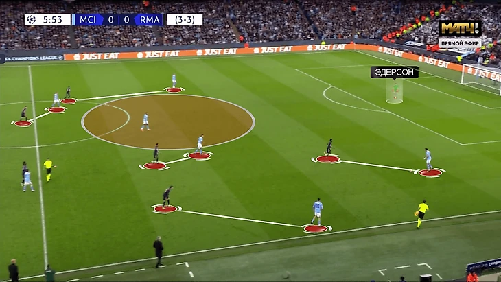 Одно из объяснений – возвращение в ворота Эдерсона. Бразилец действует ногами лучше Ортеги, который играл у «Сити» на «Бернабеу». Штефан пасовал на Холанда только планерами – под борьбу спиной к воротам, в которой норвежец не спец. Эдерсон за счет силы ног может вывести Эрлинга забросом сразу на ход. У бразильца даже есть голевая на Холанда в подобном стиле. Видимо, опасаясь, «Мадрид» предпочел более пассивный подход.
