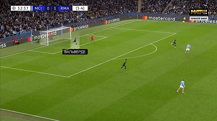 На «Этихаде» «Мадрид» чередовал подобные розыгрыши с простыми выносами мяча. Особенно явным был прием, когда вместо Лунина выносил Федерико Вальверде – номинально правый полузащитник, но с самым мощным ударом в команде: