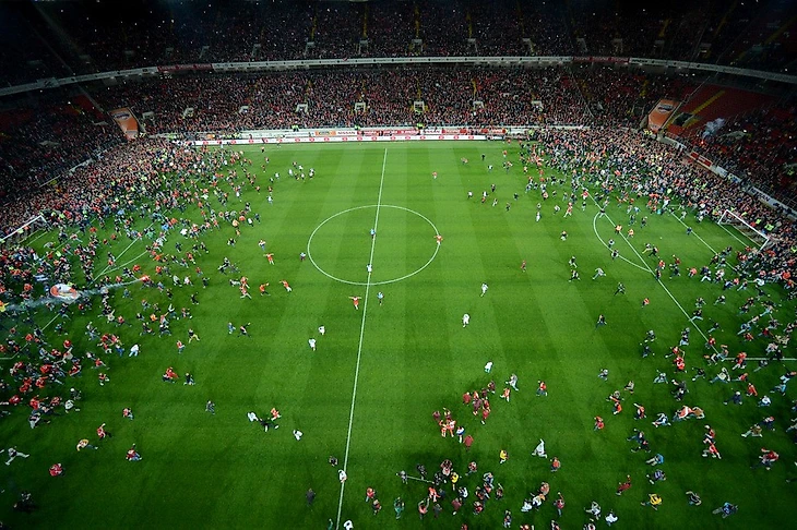 А вот фанаты «Эвертона» были вне себя не от чемпионства - чего уж тут, его не видели здесь чуть больше 40 лет, но повод был не менее серьезный - сохранение прописки - «ириски» играют в высшем дивизионе непрерывно с 1954 года, поэтому вылет был бы самой настоящей трагедией. Но мистер-плащ Фрэнк Лэмпард и его подопечные, уступая 2:0 после первого тайма, заставили старичка «Гуддисона» проснуться, подобно вулкану к 85-ой минуте - счет на табло озарил троечку в пользу хозяев - тогда-то фанаты и хлынули подобно лаве. Счет остался неизменным, «Эвертон» сохранил прописку, а фанаты во второй раз проникли на поле уже после финального свистка и отпраздновали с командой это событие.