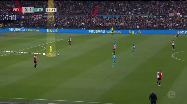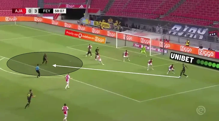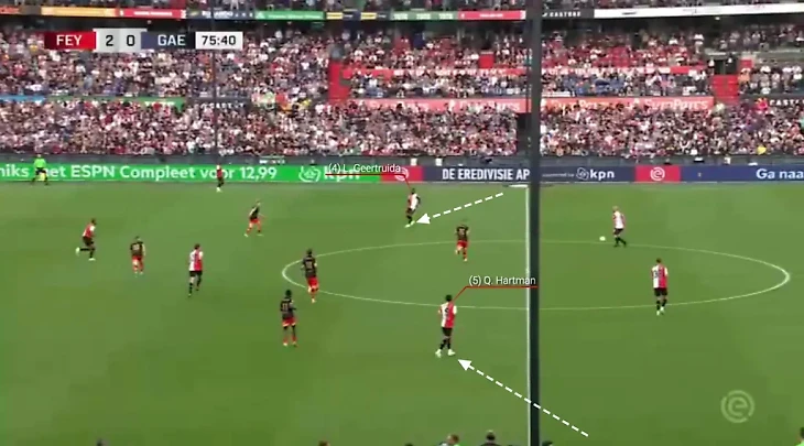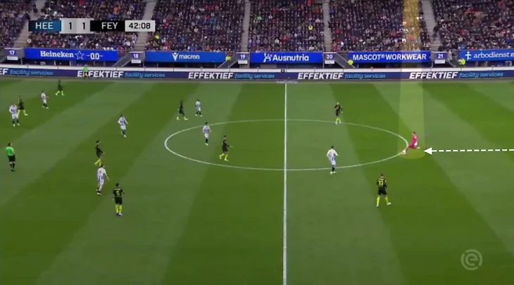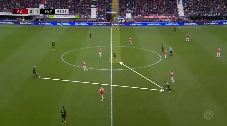 Однако, в данной ситуации фулбэк и центральный защитник со стороны мяча оттеснили вингера и атакующего полузащитника. Это открывает пространство между центральными защитниками для полузащитника «Фейеноорда», который может вбежать туда и получить пас: