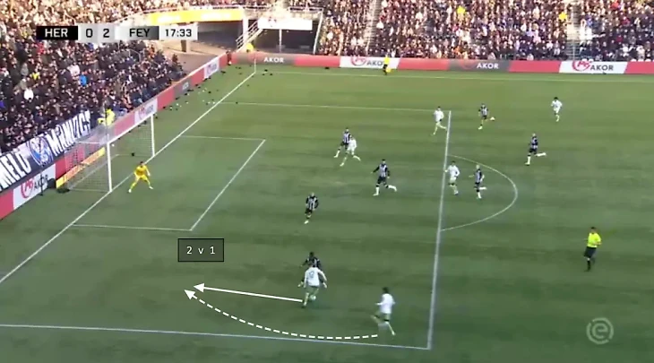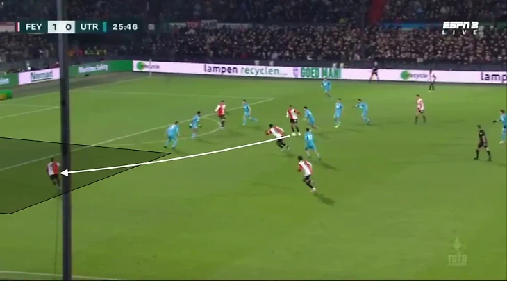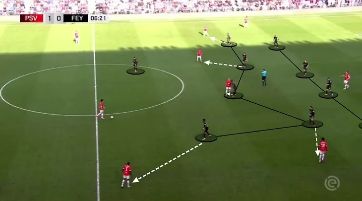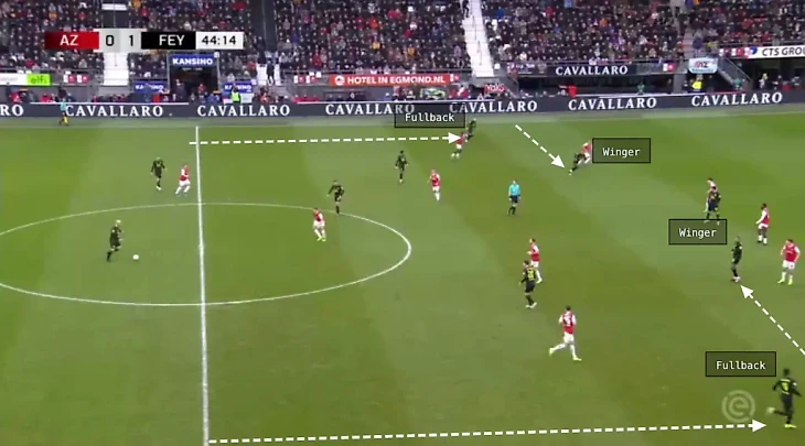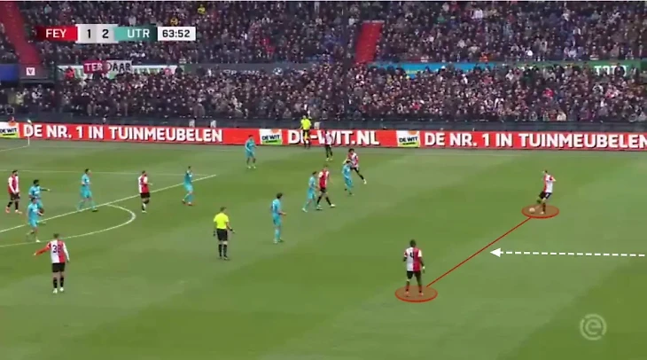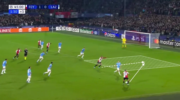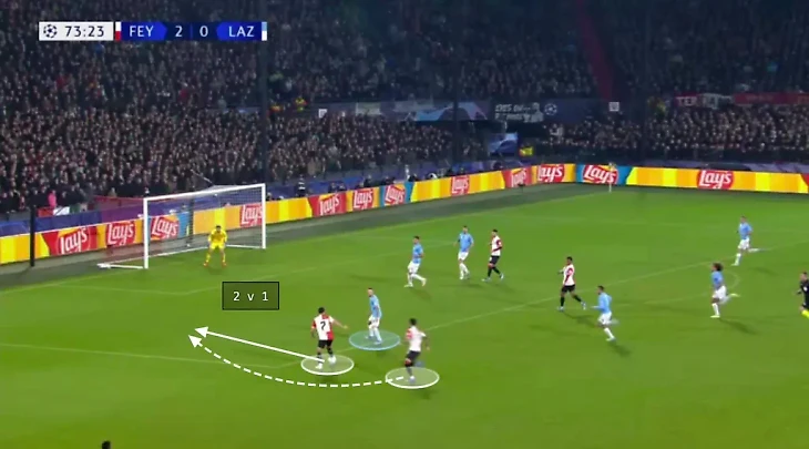 Игроки «Фейеноорда» также активно используют забегания за спину по флангу для создания моментов в финальной трети – когда вингер получает мяч, его партнер быстро совершает забегание за спину, что создает ситуацию 2-в-1 на фланге.