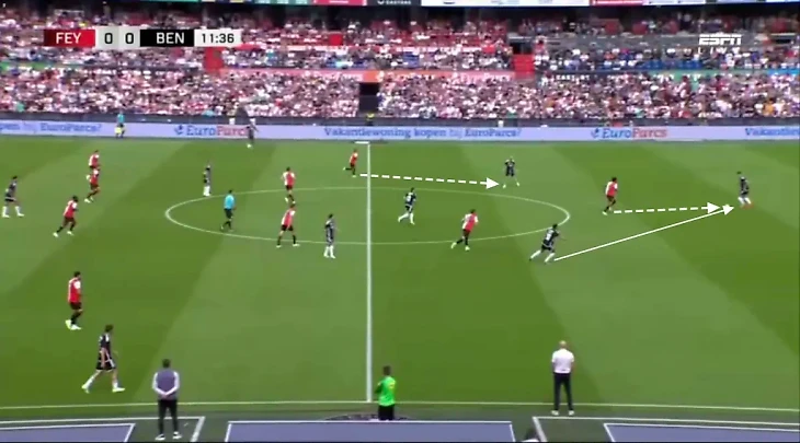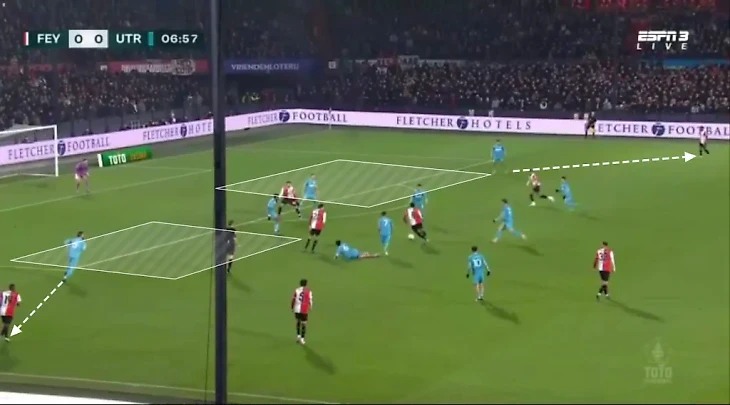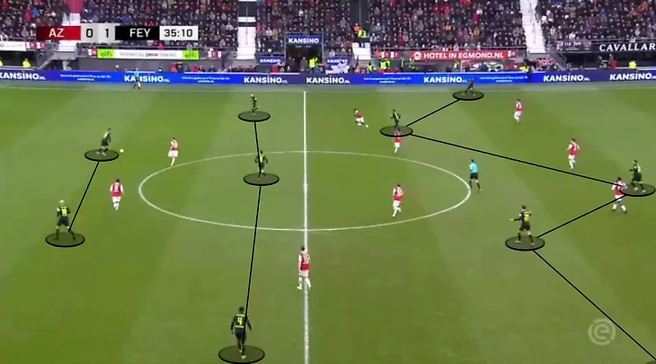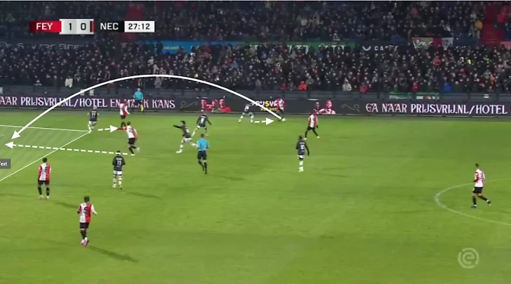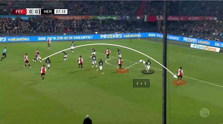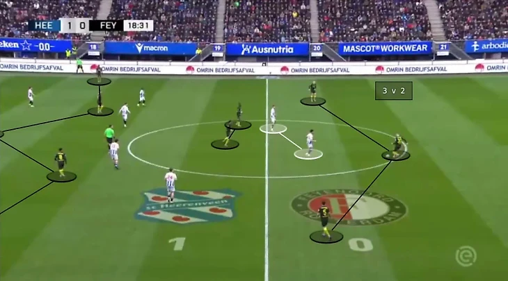 Когда защищающаяся команда располагается на одном фланге, фулбэк на другом фланге становится в этот момент уязвимым против длинного паса, поскольку он находится в ситуации 1-в-2 против вингера и атакующего полузащитника «Фейеноорда».