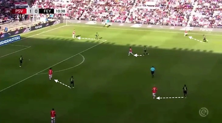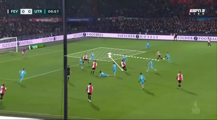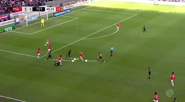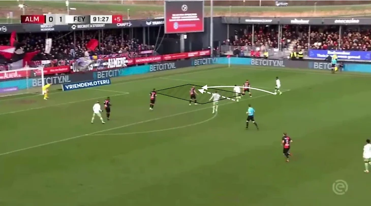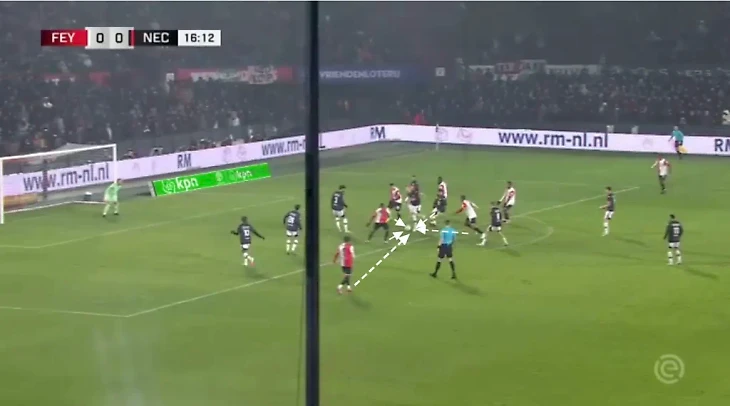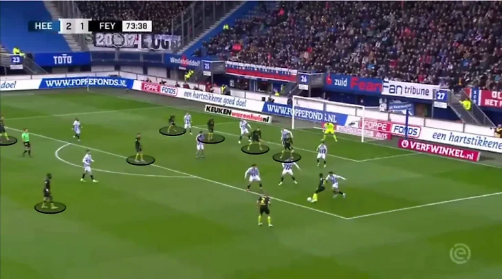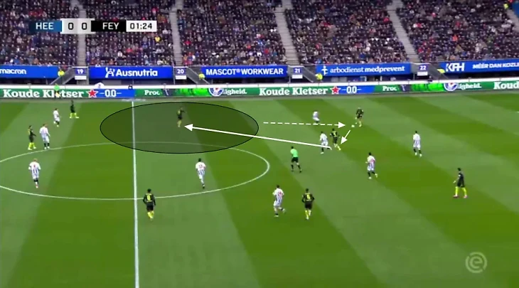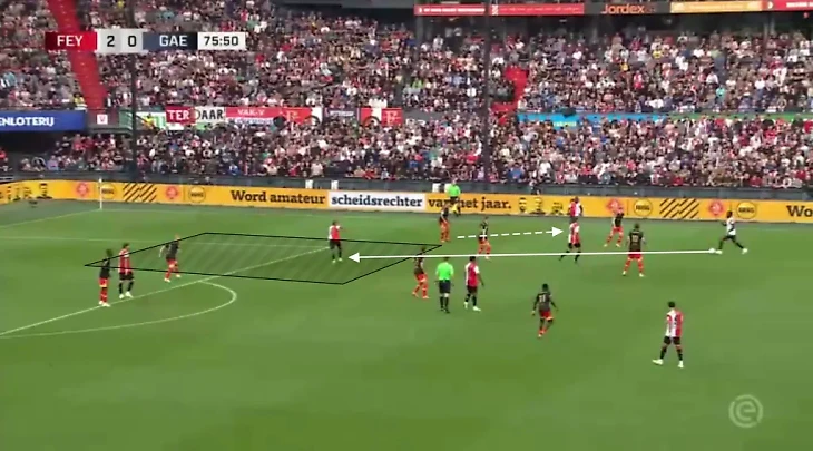 В подобных эпизодах футболисты «Фейеноорда» находят своих полузащитников в возникающем свободном пространстве, пасуя туда, после чего они могут либо самостоятельно пробить по воротам, либо разыграть комбинацию с нападающим, чтобы создать голевой момент.