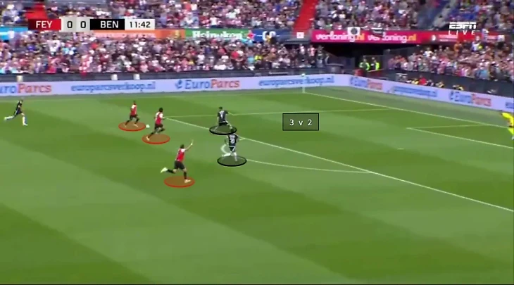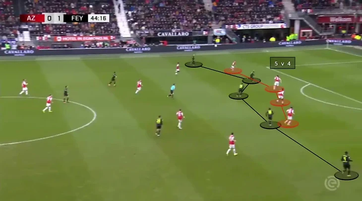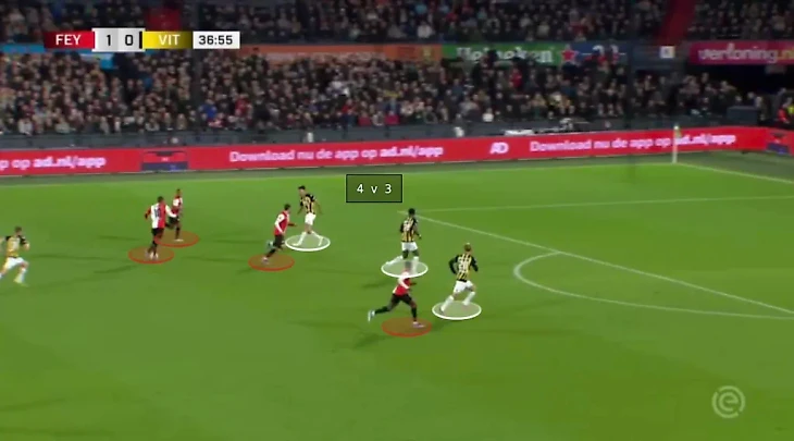 Еще одним важным аспектом игры «Фейеноорда» в финальной трети является создание численных перегрузов против линии обороны соперника. Передняя пятерка атакующих естественным образом получает численное превосходство против обороны из четырех человек, чем в последствии прекрасно пользуется.