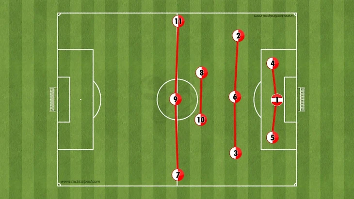 Ему необходимо иметь всего по одному игроку на флангах в высоких и широких позициях, чтобы растягивать таким образом линию обороны, в то время как остальные игроки будут создавать численное преимущество в полузащите. Это создает хорошие условия для перехода в оборонительную фазу, позволяя большему числу игроков прессинговать при потере мяча.