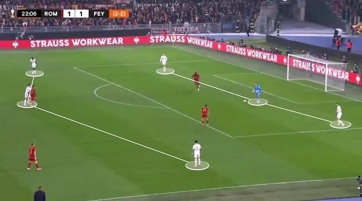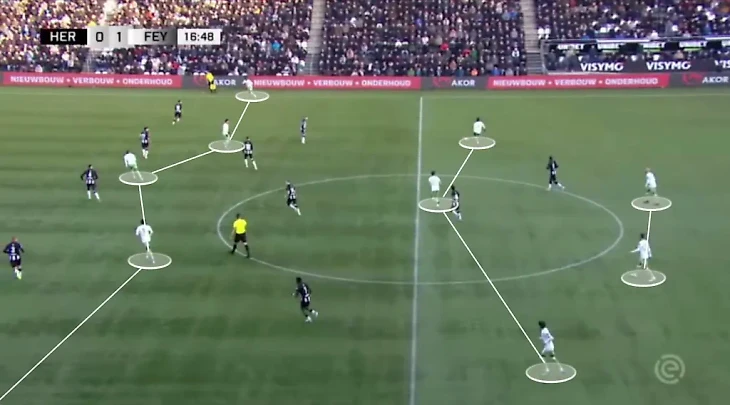 Однако, преимущество этой схемы еще и в том, что она создает численный перевес без потери дополнительного полузащитника, позволяя «Фейеноорду» держать больше игроков выше по полю без необходимости опускаться за мячом для розыгрыша.