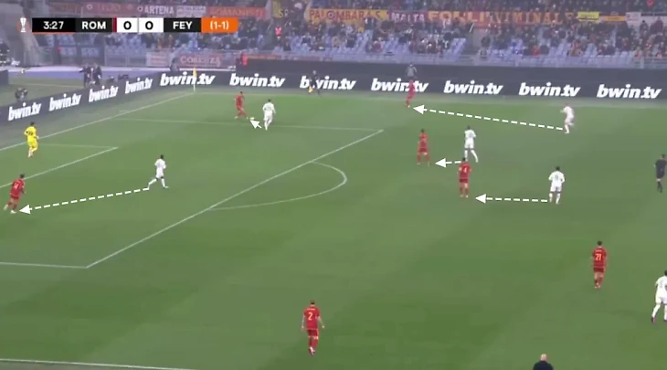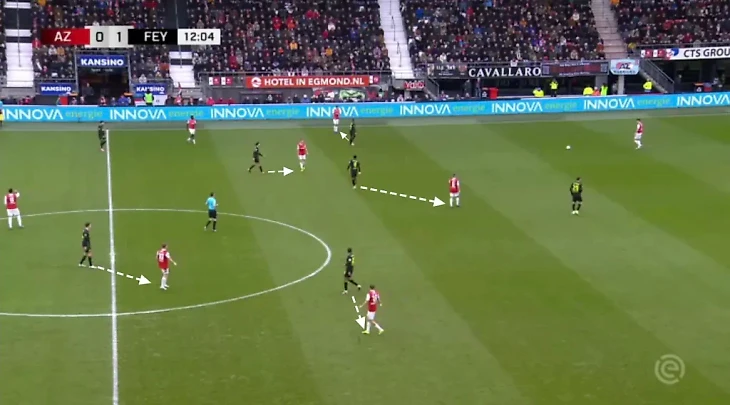 Игроки «Фейеноорда» часто успешно атакуют эти возникающие пространства благодаря врываниям и открываниям под пас со стороны полузащитников:
