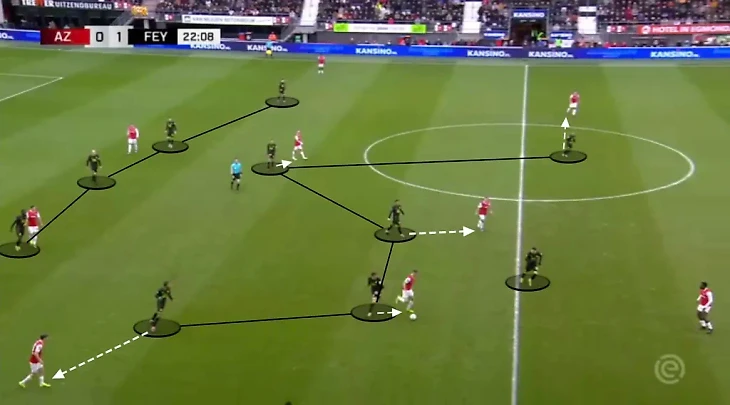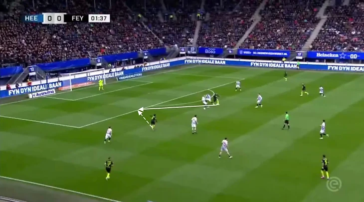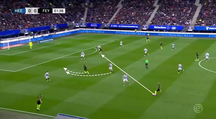 Когда они проделывают это несколько раз, защитники начинают сближаться, чтобы закрыть возникшее пространство. При этом игроки «Фейеноорда», вместо того, чтобы пытаться прорваться через плотную защиту, пасуют мяч на открытого вингера, который может спокойно принять передачу и обойти защитников соперника: