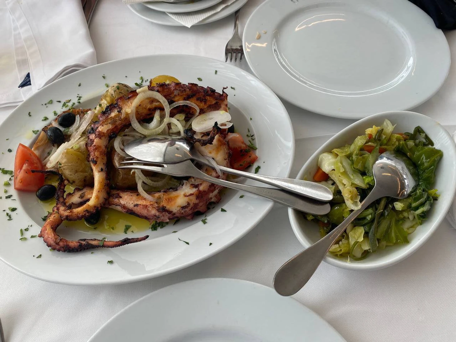 Основное блюдо подают с картошкой и овощами. Осьминог – нежный и совсем не жирный, несмотря на обилие масла на тарелке. Без вау-эффекта, который ждешь от ресторана, где обедал Абрамович, но на 7 из 10.