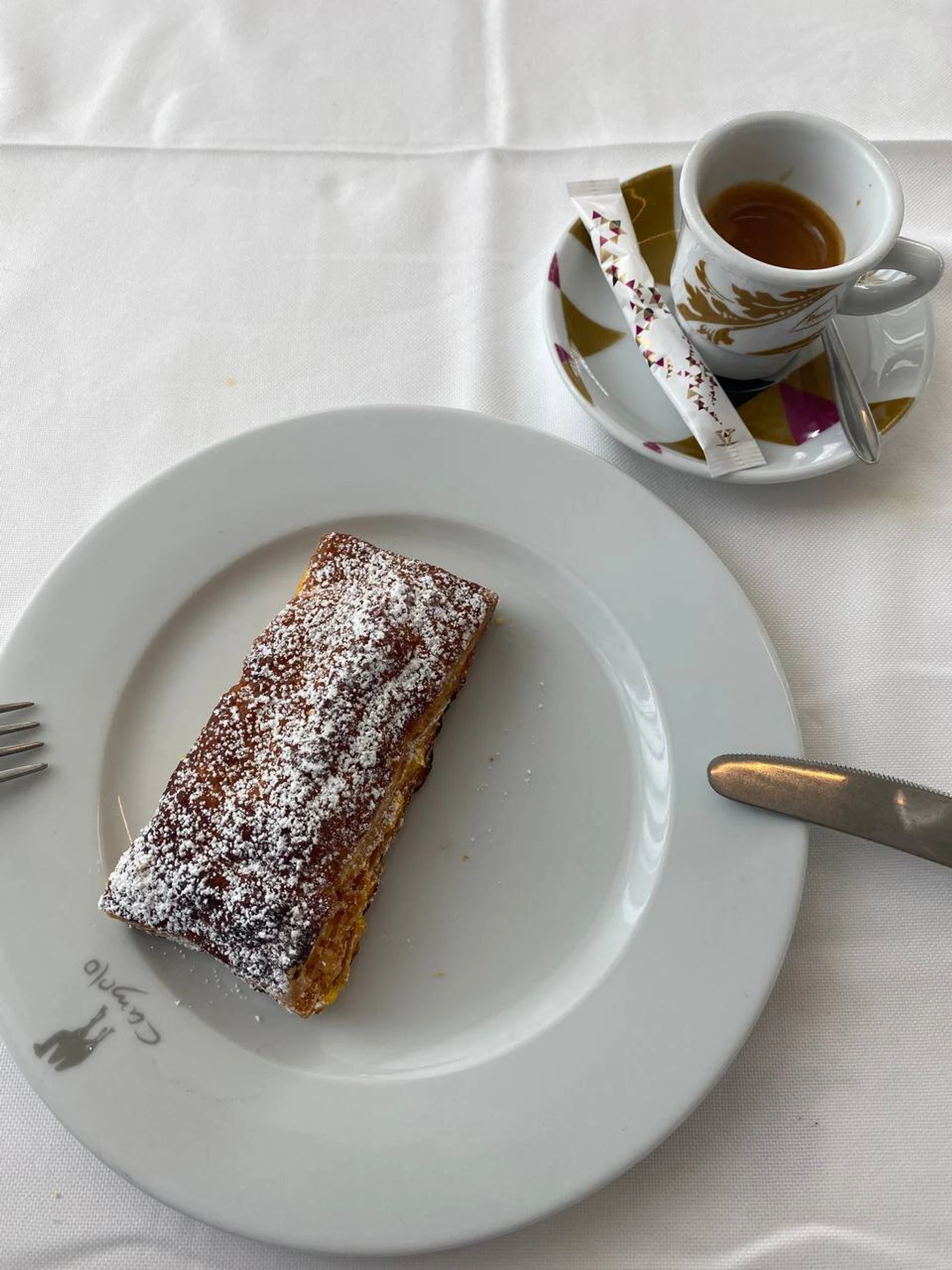 На десерт я беру слоеную булку (3,5 евро) и кофе (1 евро). На вид и вкус слойка не отличается от магазинной.