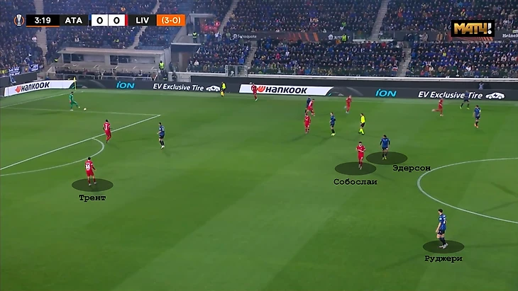 Появление Трента оказалось ключевым для преодоления прессинга Аталанты, с чем у Ливерпуля были проблемы в первом матче. В первом тайме он выполнял роль ложного фулбека со смещениями в центр. Например, в этом эпизоде после ухода Трента в центр, вместо Руджери, который играл по нему изначально, к нему выдвигается Эдерсон