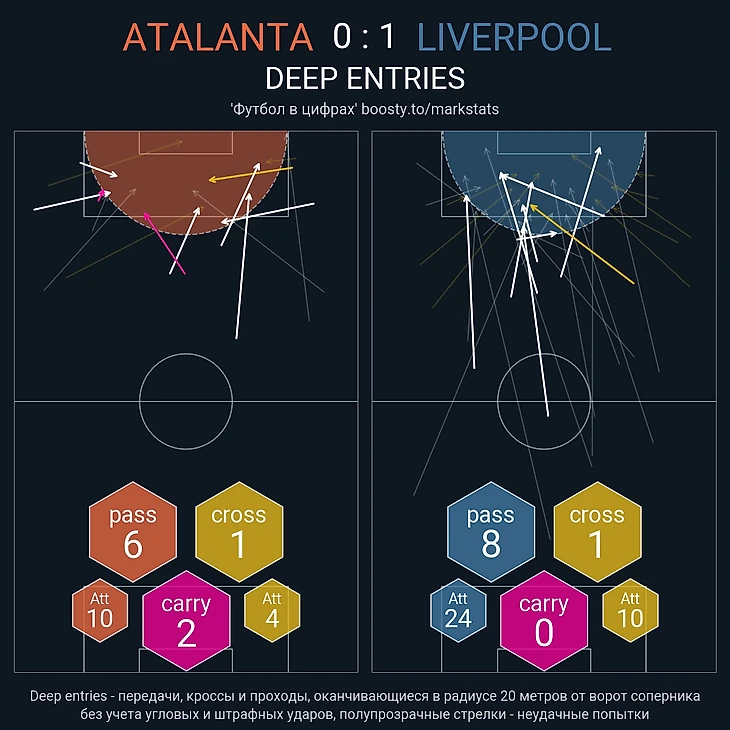 Во втором тайме Аталанта стала играть более пассивно, меньше вступая в прессинг. Это как раз сильно уменьшило свободное пространства для игрков Ливерпуля. К тому же, Александер-Арнольд перестал исполнять свою роль ложного Фулбека, играя в более классической манере, а потом и вовсе был заменён. После матча Юрген Клопп сказал: «Как вы сегодня видели, Трент Александер-Арнольд… пока он был свеж, он вместе с Мак Аллистером задавал ритм и направление игры, но, очевидно, что у него не хватало сил». Так что у такого спада были объективные причины. Но забросы никуда не делись, их продолжали делать Алиссон и центральные защитники с тем же Мак Аллистером, но голевых моментов у Ливерпуля больше не было. В контексте этих самых забросов интересно посмотреть на график из телеграм канала «Футбол в цифрах», который показывает попытки Deep Entries (передачи, кроссы и проходы, заканчивающиеся в радиусе 20 метров от ворот).