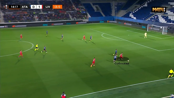 Аталанта из-за своего персонального прессинга часто оставляла свободные зоны на поле, что могло нести опасность в случае успешного преодоления этого прессинга. Легче всего это сделать с помощью длинных забросов, чем Ливерпуль и пользовался. В первом тайме в этом компоненте выделялся Трент. В этом моменте, получив мяч на правом фланге, он сразу перевёл мяч вперёд на противоположный фланг, воспользовавшись тем, что там не так много футболистов соперника.