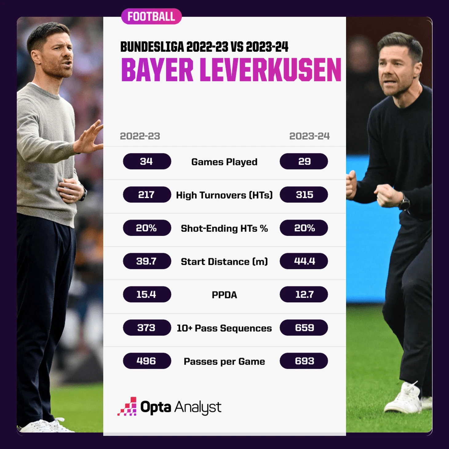 В сезоне 2022/23 леверкузенцы 217 раз возвращали мяч в высоких позициях (в радиусе 40 метров от ворот соперника), 20% из которых привели к удару по воротам. В этом сезоне они сохранили эффективность, но стали количество отборов за счет высокого прессинга возросло почти на треть - до 315 (первый показатель в Бундеслиге).