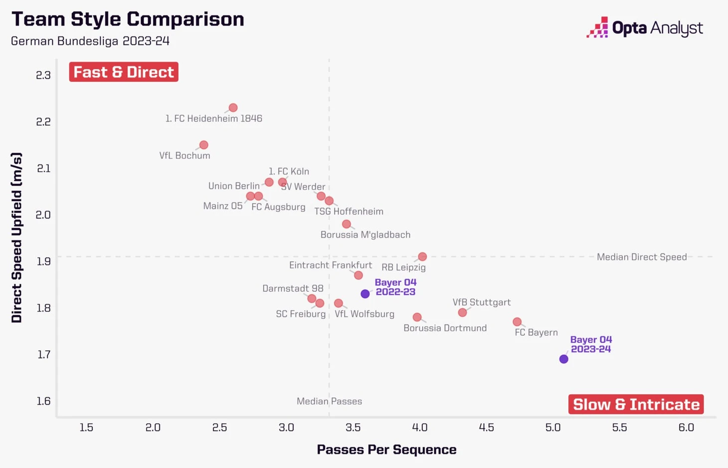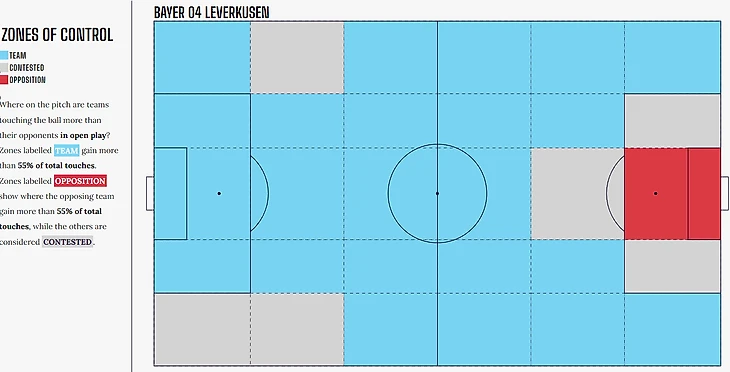 Несмотря на то, что в прошлом сезоне «Байер» в среднем владел мячом больше соперников (51,8%), команда Алонсо искала свои шансы в контратаках, используя скорость Мусса Диаби. В этом сезоне среднее владение выросло до 63,1%, что говорит о «Байере» как о команде, заточенной на контроль мяча. Выше леверкузенцев по этому показателю только «Барселона» (65%), «ПСЖ» (65,5%), и «Ман Сити» (65,9%).