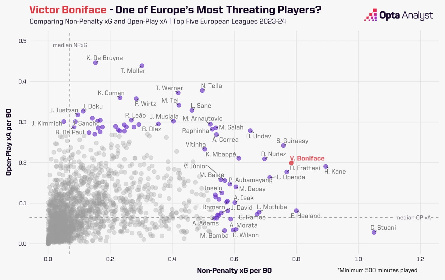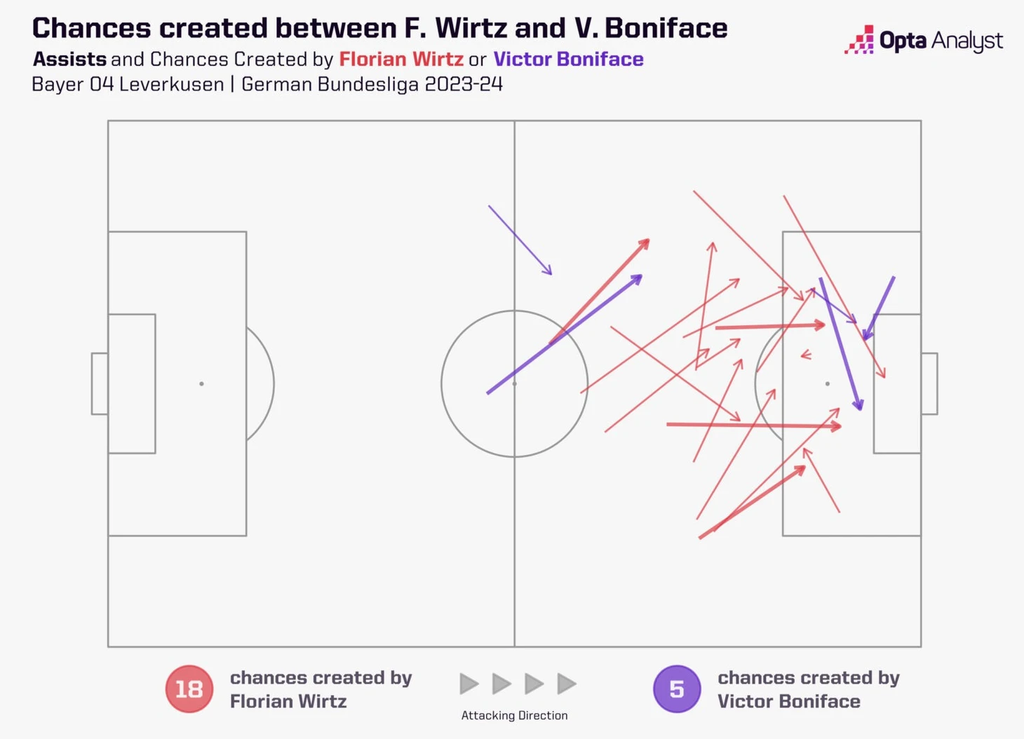 Взаимодействия Виртца с Бонифейсом имели огромное значение для результативности в начале сезона. До Рождества они забили в Бундеслиге 7 голов на двоих, но затем нигериец получил травму, от которой он он оправился только в начале апреля.