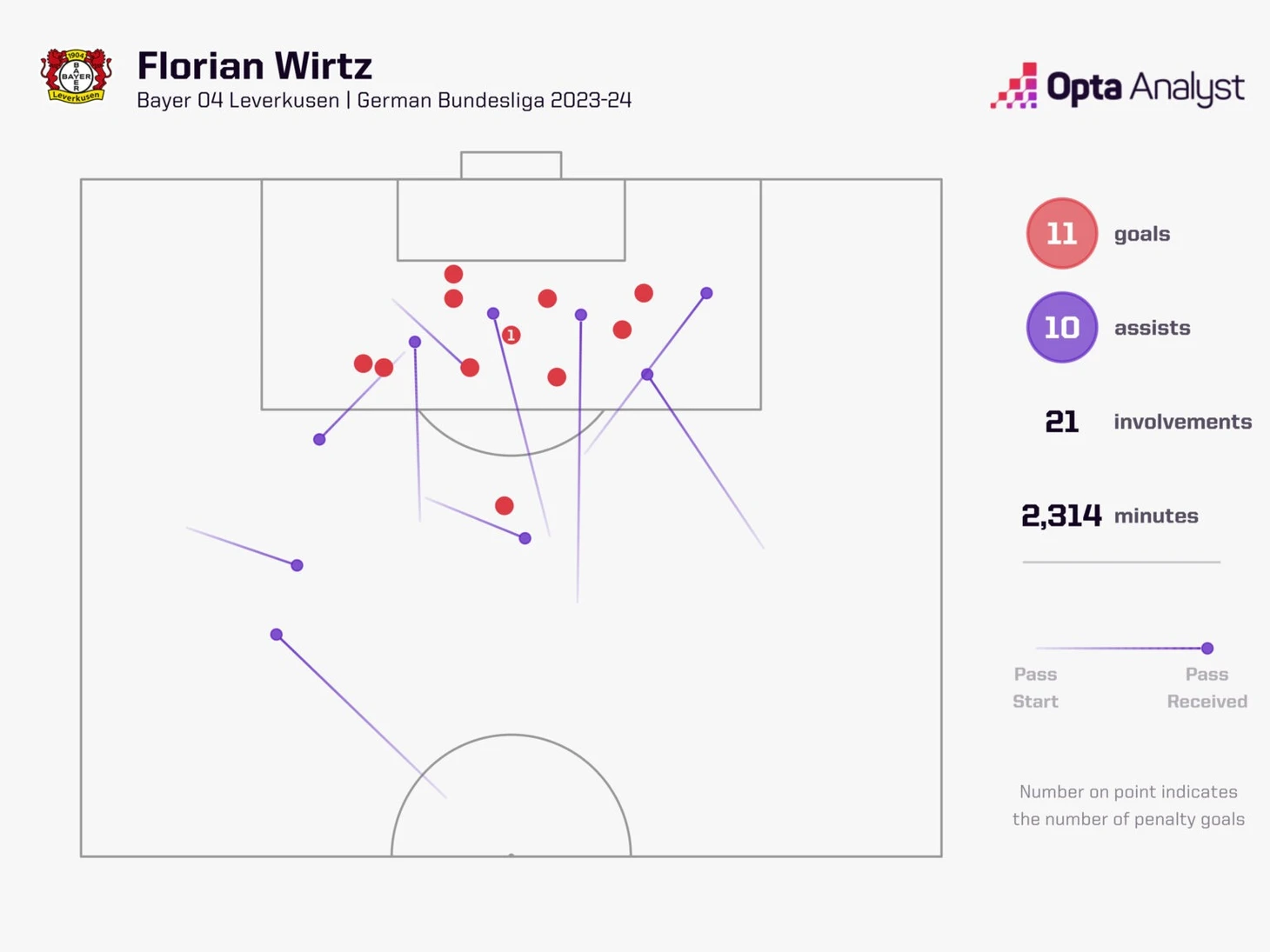 Разумеется, в ассистах молодому немцу пару раз сопутствовала удача: гол Андриха дальним ударом в февральском матче против «Майнца» и мяч Хофманна «Фрайбургу» - ни что иное, как вратарский курьез и стечение обстоятельств. Тем не менее, 9 xA (показатель ожидаемых ассистов) подтверждают то качество, которое Флориан привносит в игру команды Алонсо.
