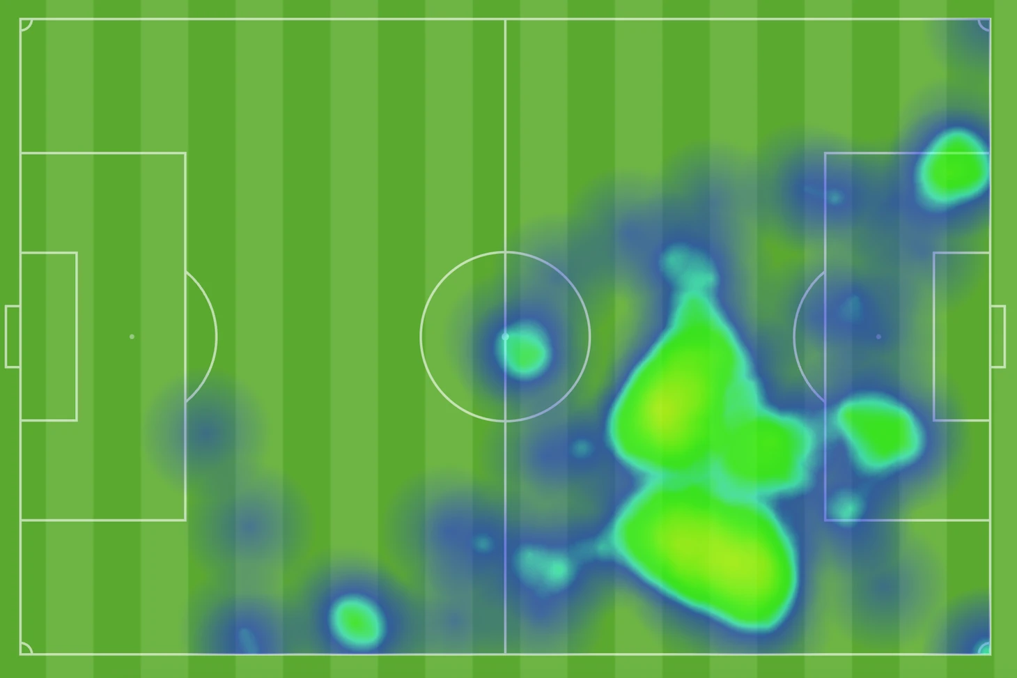 Вот тепловая карта Палмера из недавнего матча с «Бернли». Наглядно демонстрирует свободу, схожую с тем, что была у Ди Марии в «Мадриде». Фактически Коул перемещается по всей правой части поля – его нельзя назвать ни восьмеркой, ни десяткой, ни вингером. В одном игроке умещаются все три роли: