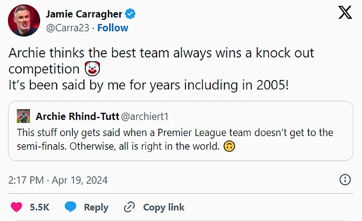 В ответ на слова Ринд-Татта Каррагер написал: «Арчи считает, что в турнире на выбывание всегда побеждает лучшая команда 🤡 Я говорил это на протяжении многих лет, в том числе и в 2005 году!»