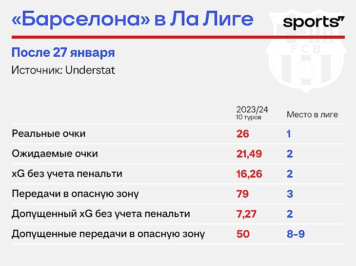 ● Структура 3-2-4-1 при владении заработала без сбоев (максимально похожа на конфигурацию «Ман Сити» в последние месяцы Илкая в клубе). После поражения от «Вильярреала» (3:5) «Барселона» в лиге набрала больше всех очков, а по xG и xGA без учета пенальти эффективнее оказался только «Реал».
