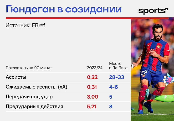 Яркий индикатор важности Илкая – игровые минуты. В Ла Лиге он провел 88% времени. Ближайшие преследователи серьезно отстают: у Жюля Кунде 81,3%, а у Роберта Левандовского – 80,2%. Немец стал жизненно необходимым инструментом.