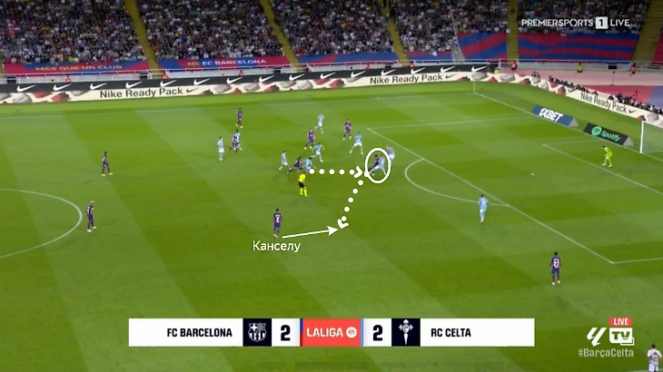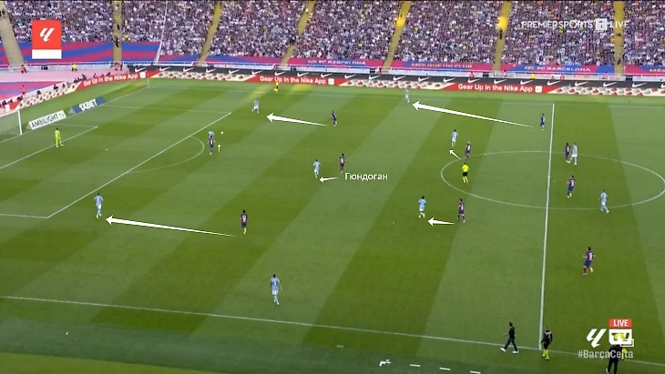 Обратный случай. «Барселона» насытила левую часть поля – Гюндоган заметил одинокого Жоау Канселу и в касание доставил ему мяч. Португалец пробил, хотя в теории мог еще и покатить направо Ямалу.