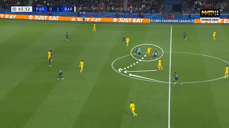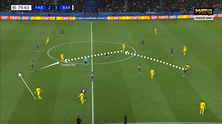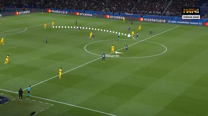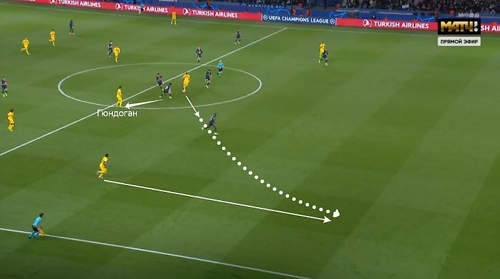 Выбрался даже из такой ситуации. Илкай привычно открылся на уровне линии обороны «ПСЖ» под опекой Витиньи. Очевидных вариантов для паса нет, поэтому нужно дальше сканировать поле.