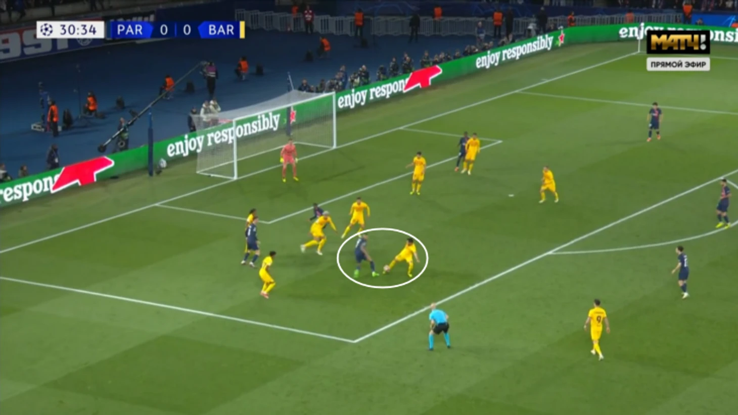 Похожий эпизод, но в другом ключе. Илкай постоянно перегружал линию обороны «ПСЖ» и вынуждал Витинью уходить ниже. Так и произошло перед открыванием Левандовского.