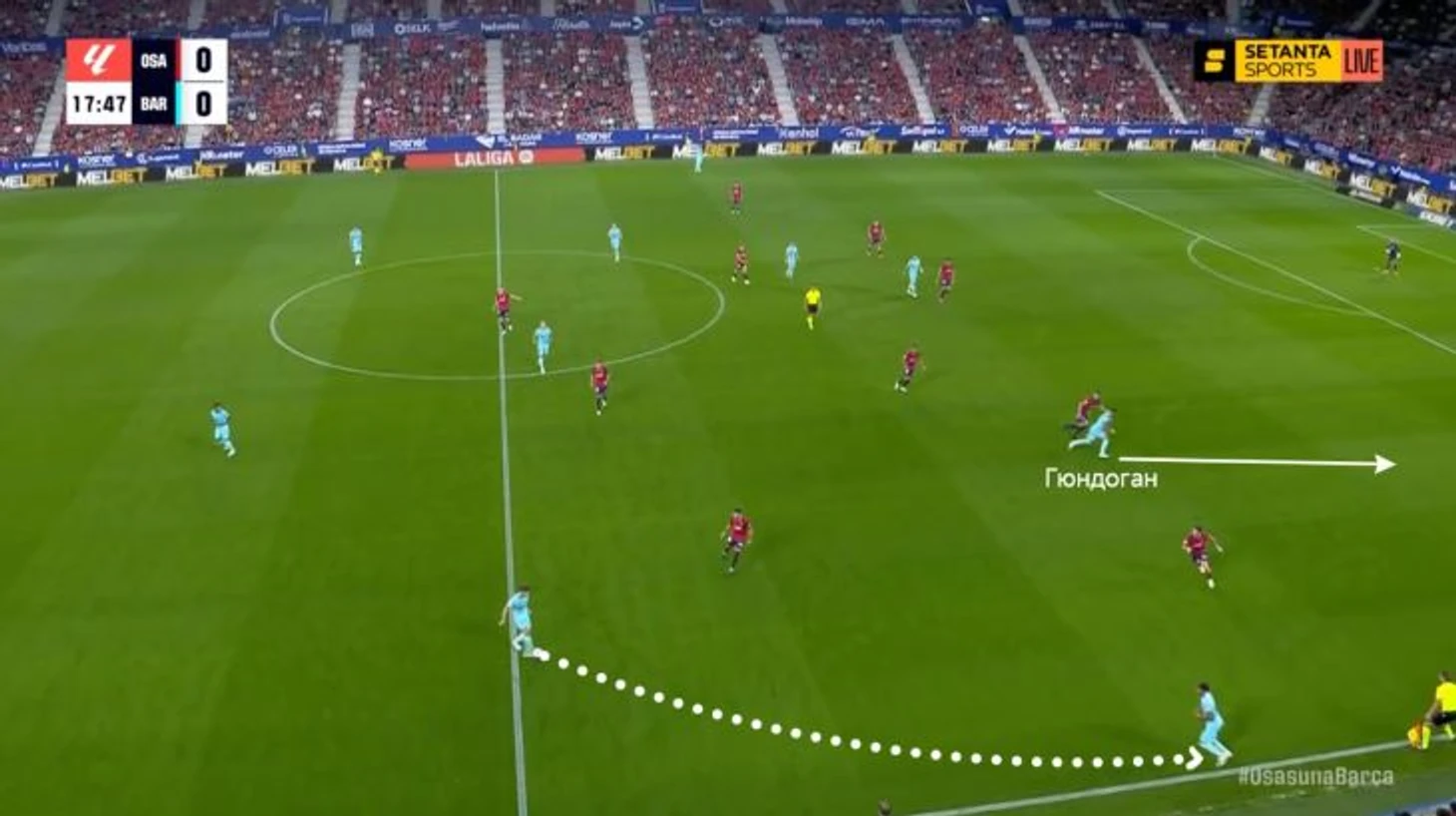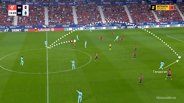Проблема обострилась именно на позиции правого инсайда. Вот сразу два случая из матча с «Осасуной» (4-й тур). Сначала Кристенсен не решился на длинный пас и отдал ближнему.