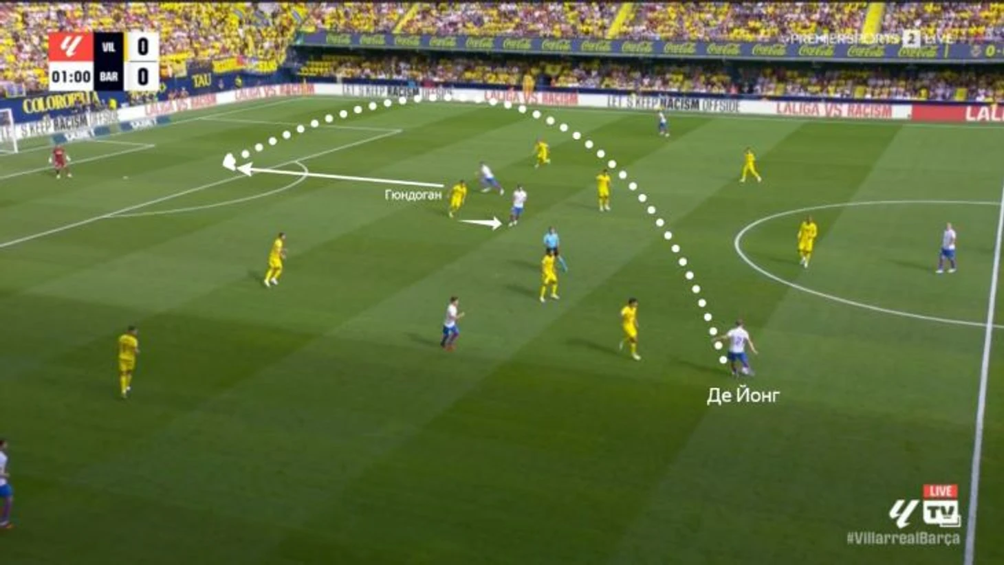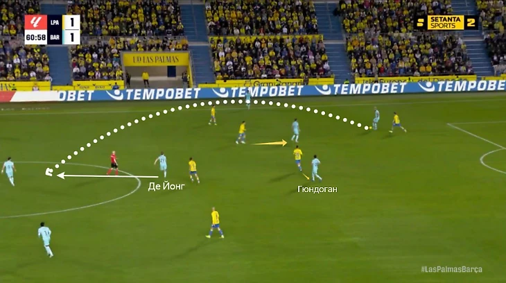 В игре с «Лас-Пальмасом» Илкай утащил Кириана Родригеса чуть левее, а Серджи Роберто пришел на помощь в начале атаки и отвлек Максимо Перроне. Френки заметил это и рванул ему за спину (Хави Муньос не накрыл). В итоге он вывел свободного Торреса на прострел из штрафной.