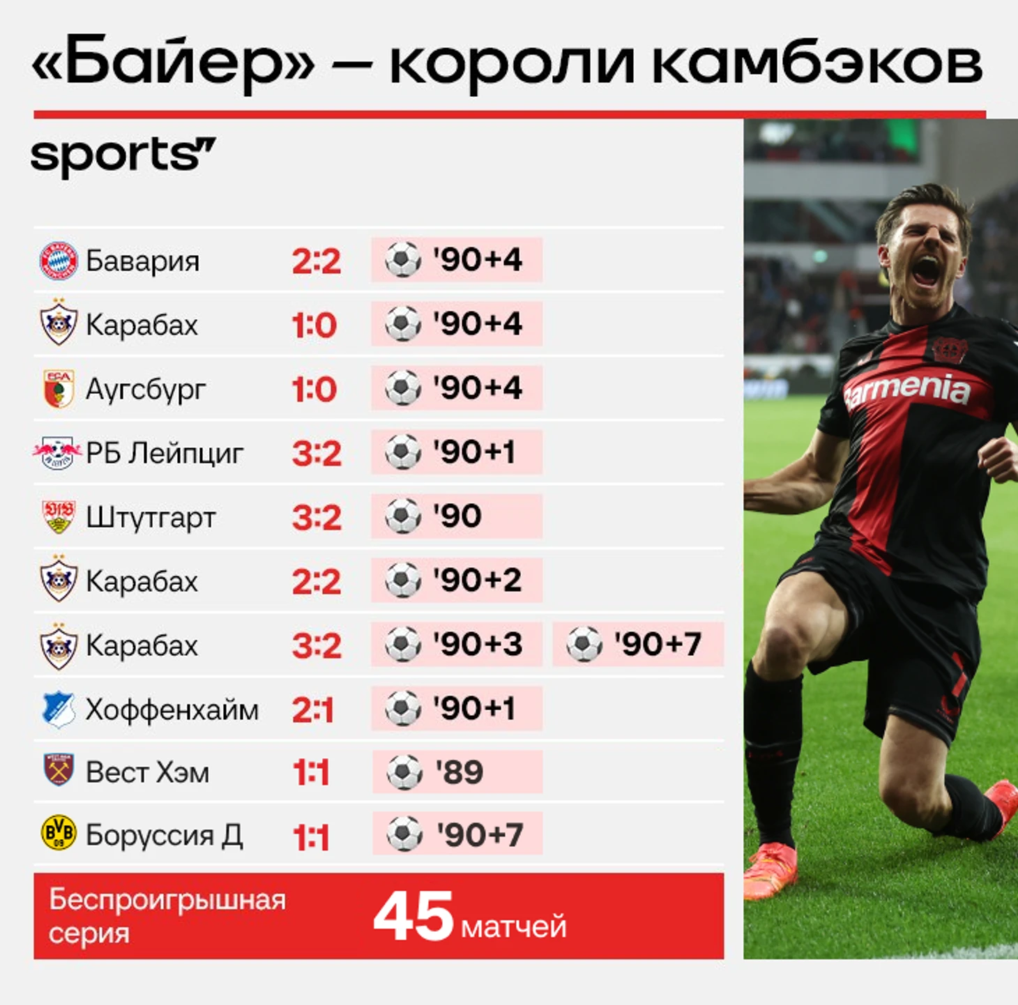 «Байер» продлил серию без поражений до 45 матчей во всех турнирах. Набрали 38 побед и 7 ничьих. Не проигрывают с начала сезона-2023/24: в последнем туре прошлого получили 0:3 от «Бохума». А в этом забыли про поражения.