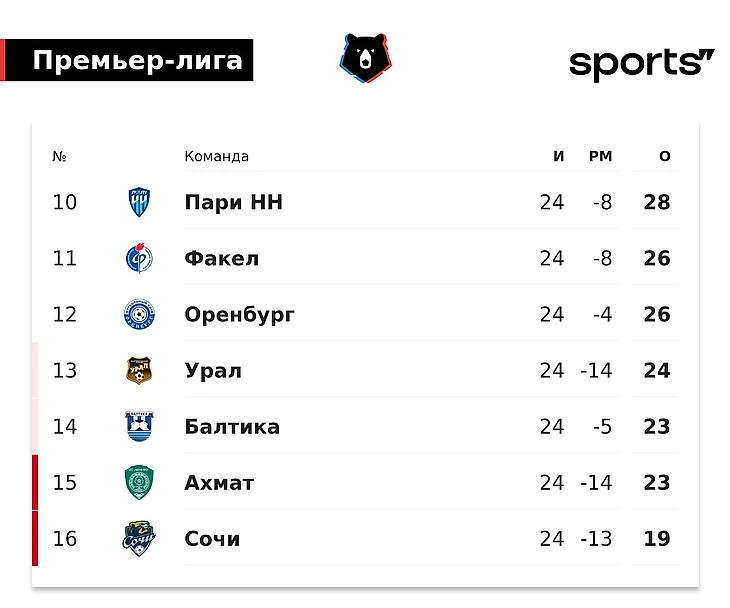 Напоминаем: 15-е и 16-е места – прямой вылет, 13-е и 14-е – стыковые матчи против команд из Первой лиги.