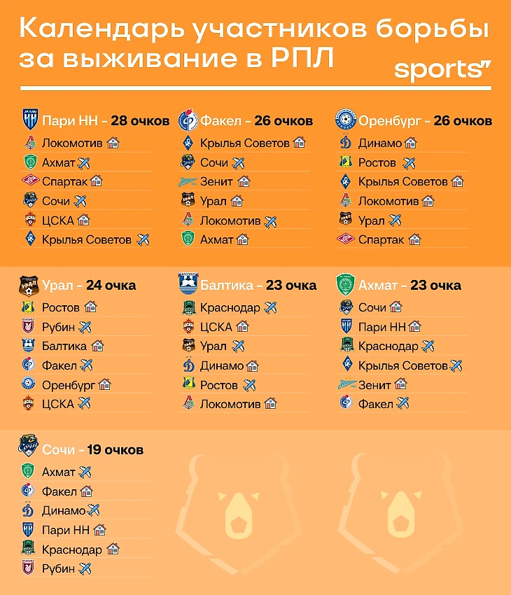 Два следующих тура очень важны – там «Сочи» и «Пари НН». Дальше тяжело – «Краснодар» и «Зенит», между которыми – «Крылья». Интрига – будет ли матч последнего тура с «Факелом» решающим для обеих команд?