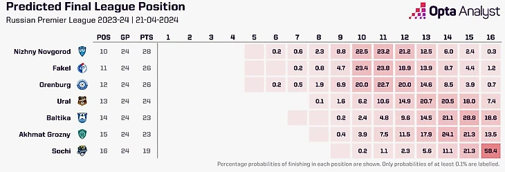 Анализ от Opta: «Сочи» и «Балтика» – главные аутсайдеры, «Урал» и «Ахмат» попадут в стыки.