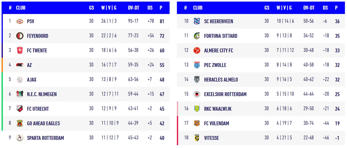 Витесс получил штраф от лиги в размере 18 очков за нарушение правил лицензирования и теперь уже официально вылетает. Пожелаю им удачи в сохранении статуса профессиональной команды. А в предстоящем туре успеха желаю Фортуне, потому что планирую поставить на их победу. Коэффициент 2,04 очень высокий на выигрыш мотивированной команды, которая умеет выстроить защиту, против немотивированной и пускающей больше всех в лиге. Думаю, что к воскресенью коэф просядет до 1,8 или около того. Фортуна победит / 2,04