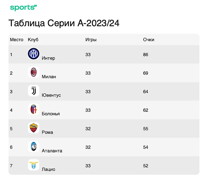 А вот рекорд по очкам покорить не получится: даже в случае побед во всех оставшихся турах команда Симоне Индзаги наберет 101 очко – на одно меньше, чем «Ювентус» Антонио Конте в сезоне-2013/14 (102).