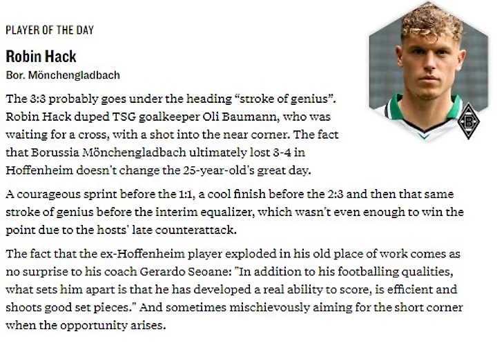 Робин Хак впервые сделал хет-трик в Бундеслиге за «Боруссию Менхенгладбах». Он сделал это против своего бывшего клуба – «Хоффенхайма», – причем забил правой ногой, левой ногой и головой;
