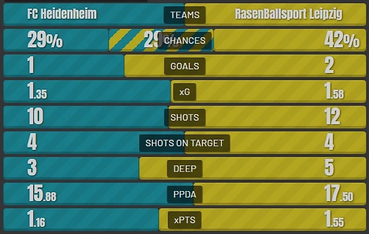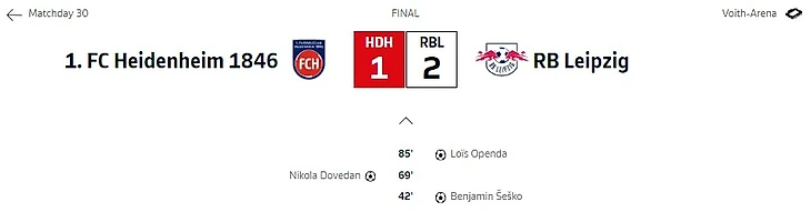 После перерыва «Хайденхайм» все же отыгрался. На помощь пришло стандартное положение: после шикарной передачи Шеппнера нападающий Доведан забил головой. Правда, выстоять хозяевам все-таки не удалось: на 85-й минуте финальную точку поставил звездный форвард «Лейпцига» Лои Опенда.