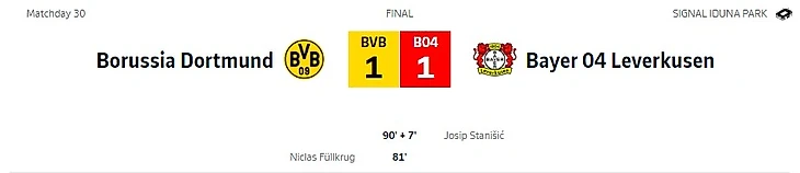 Дортмундская «Боруссия» потеряла очки против лидера Бундеслиги в девятый раз (три ничьи, шесть поражений);