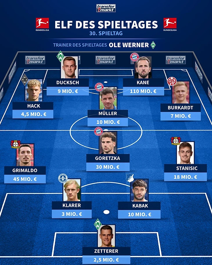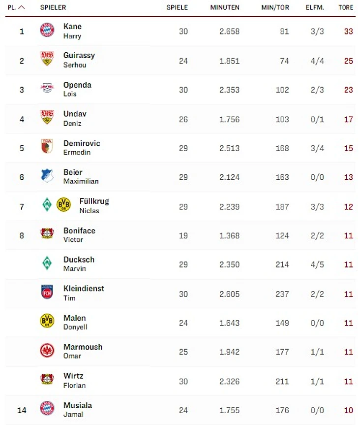 Харри Кейну понадобилось всего 30 игр, чтобы забить первые 33 гола в Бундеслиге. Он побил 60-летний рекорд Уве Зеелера (уроженец Гамбурга забил свой 33-й гол в 33-й игре);