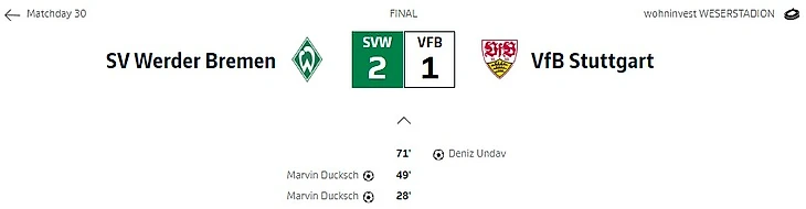 «Вердер» отлично пользовался моментами, ловя «Штутгарт» на контратаках. Но в итоге команду вновь затащил Марвин Дукш. Немец оформил дубль: сначала на 28-й открыл счет с пенальти, затем на 49-й замкнул шикарный кросс с правого фланга. Для Дукша это уже 11-й гол в сезоне, а в сумме он набрал уже 16 результативных действий.