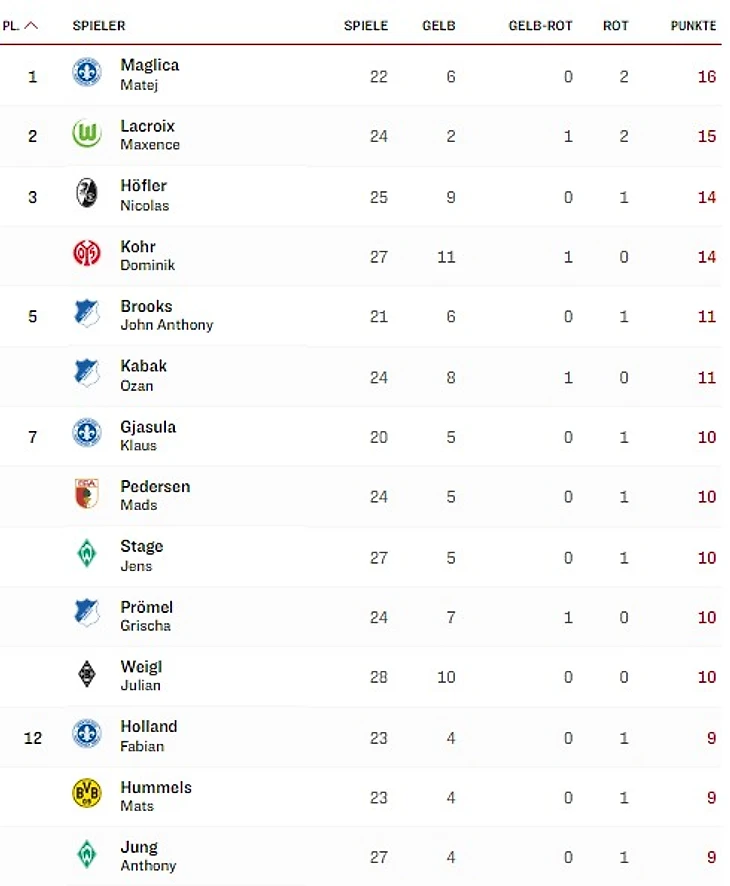 *игрок – кол-во игр – желтые – 1+1 желтые – красные – всего