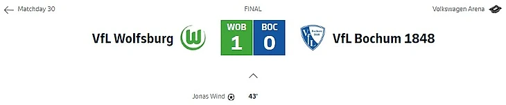 Если «Айнтрахт» и «Аугсбург» боролись за евросезон, то «Вольфсбург» и «Бохум» бились за то, чтобы не спуститься в зону стыков. Надо сказать, что игра была довольно равной, но с реализацией моментов меньше проблем было у хозяев. Под конец первого тайма нападающий Йонас Винд забил единственный мяч в этом матче. Винд – светлое пятно этого страдающего «Вольфсбурга»: на счету Йонаса десять голов и семь результативных передач.